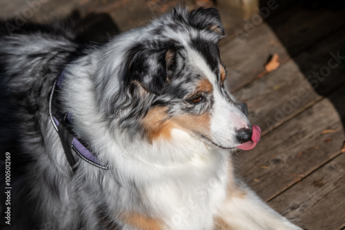 A closeup of an Australian shepherd puppy or Aussie with its mouth open and its long pink tongue hanging out. The young dog has brown, grey, white, and black fur. The dog has Corneal degeneration.