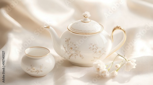 A close-up of an elegant white teapot and creamer with gold trim and delicate floral patterns, arranged on a soft, neutral background.