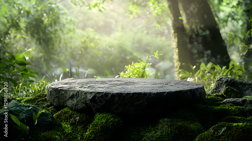 A close-up of an empty stone pedestal on mossy rocks in the forest