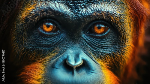 a close-up of an orangutan face, its eyes gazing directly at the viewer, revealing a deep and profound gaze. The fur around the face is a mix of orange and brown