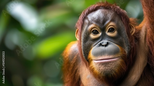 A close-up of an orangutan's face, showcasing its expressive features and lush green background, highlighting the beauty of nature and wildlife.