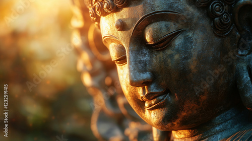 A close-up of Buddha's calm face, with intricate curls of his hair and the urna on his forehead, bathed in soft sunlight