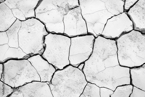 A close-up of cracked, dry soil, showcasing the effects of drought and soil erosion in a monochromatic style.