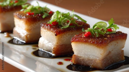 A close-up of crispy pork belly served with a drizzle of fish sauce, the golden edges contrasting against the white plate, with soft, diffused lighting from the side