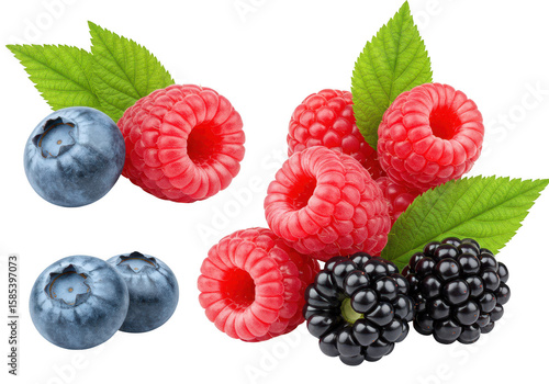 A closeup of fresh raspberries, blueberries, and blackberries isolated on transparent background, showcasing their vibrant colors and textures
