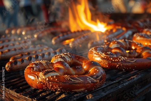 A close-up of freshly baked pretzels and grilled sausages on a grill at a bustling street food market, The aroma of freshly baked pretzels and grilled sausages filling the air