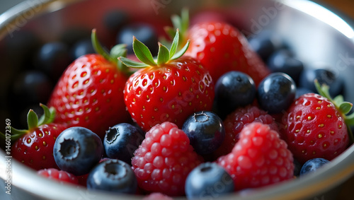A close-up of freshly washed strawberries, blueberries, and raspberries in a metal colander, water droplets visible, with soft natural light highlighting freshness and juiciness.