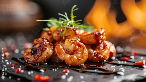 shrimp, food, glaze, herb, plate, cooking, cookery, epicure, favor, meal, seafood, presentation, spicey, delicious, receipe, dinner, culinary, eatery, chef, ingredient, tasty, grill, heat, garnish, dining, elegance, sauce, fresh, vibrant, texture, aroma, indulgence, creativity, colours, sweet, savoury, alimentary, grilling, plating, dish