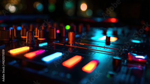 dj, equipment, music, electronic, party, nightclub, performance, sound, technology, light, control, panel, audio, mixer, console, neon, dance, club, entertainment