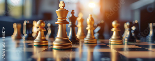 A close-up of golden chess pieces on a chessboard, with the king piece in focus. The image represents strategy, competition, and planning.