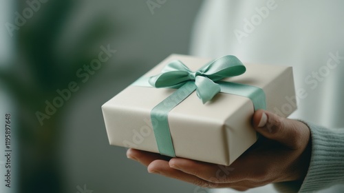 A close-up of hands holding a neatly wrapped gift box with a teal ribbon. The background is softly blurred, highlighting the boxed present.