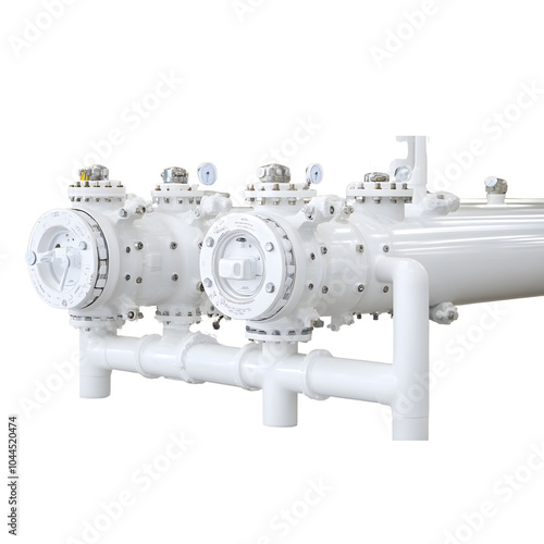 A close-up of industrial white valves and pipes, showcasing precision engineering and robust design for fluid control systems.