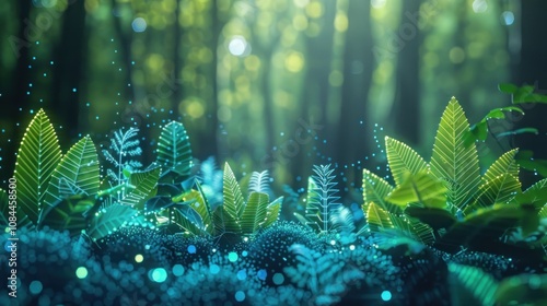A close-up of lush green foliage and moss in a forest with glowing blue particles.