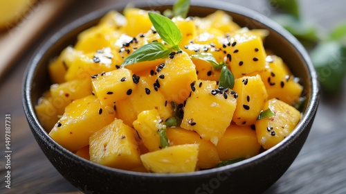 A close-up of mango cabbage slaw served in a bowl, combining tropical and crisp flavors
