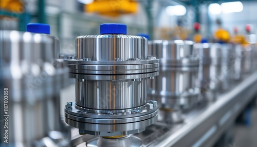 A close-up of metallic industrial components lined up in a factory setting, showcasing precision engineering and manufacturing processes.