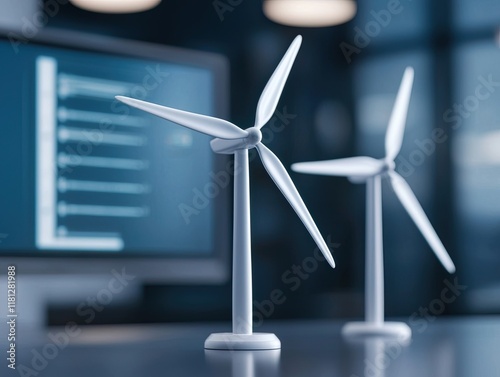 A close-up of miniature wind turbines on a desk, with a digital screen in the background, symbolizing renewable energy and technological innovation.