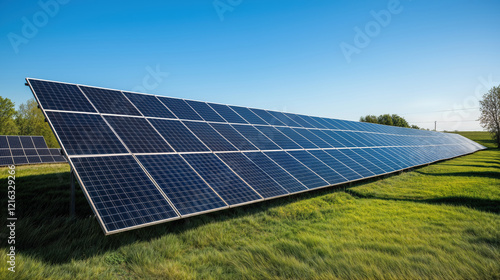 A close-up of modern solar panels surrounded by trees in a peaceful country side.