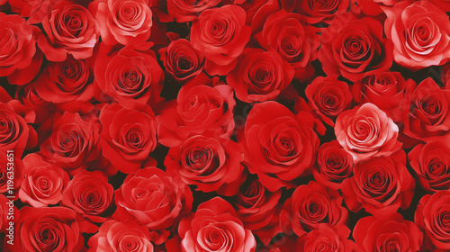 A close-up of red roses, forming an abstract background. The roses should be arranged in a bouquet-like pattern with each rose facing the camera directly from above. Valentine day