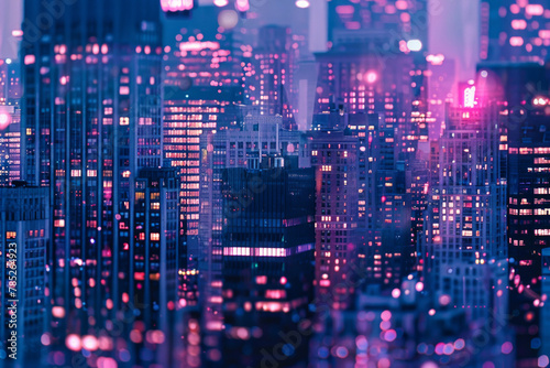 A closeup of skyscrapers in a city during nighttime using a telephoto lens