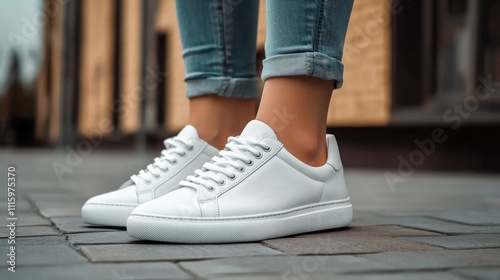 A close-up of stylish white sneakers worn with rolled-up jeans on a paved surface.