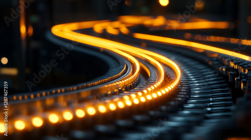 A close-up of the conveyor belt with orange LED lights on it, illuminated by bright light and a blurred background