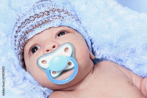 A Closeup of the face of a tiny, newborn baby boy wearing a blue