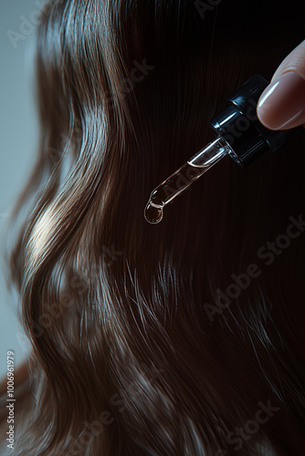 A close-up of woman's hand applying hair oil to her long, flowing brown locks against a white background, with the focus on one drop dripping from an eyedropper onto her head, high