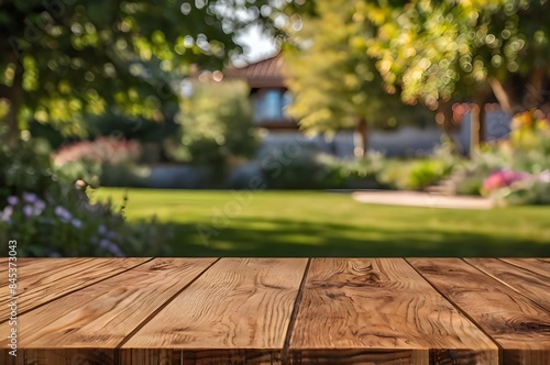a closeup of wooden table top with a blurred natural background. product photography