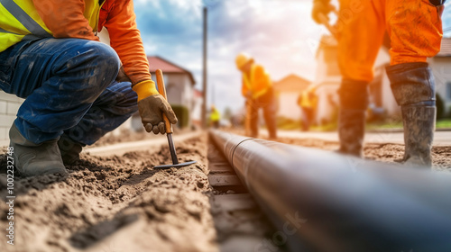 men at work, securing, ground, industrial tool, machine, align, home, building, nearby, construction, infrastructure, development, maintenance, urban, city, project, pipeline, installation, teamwork, labor, heavy equipment, machinery, labourer, glove, underground, engineering, technology, progress, precision, job site, construction site, pipe, seamless, coordination, efficient, professional