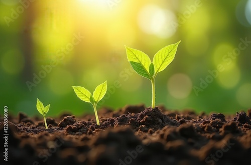 A close-up of young plants growing from the soil with sunlight filtering through, symbolizing the sustainability and environmental growth concept. The soft, glowing background enhances the theme of na