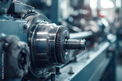 A close-up photo capturing the intricate details of a machine in a bustling factory, displaying its mechanical components in motion.