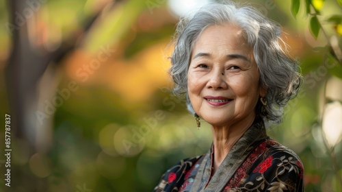 woman, female, smiling, happy, portrait, garden, outdoors, nature, flower, tree, leaf, green, brown, grey, hair, face, eye, mouth, teeth, wrinkle, skin, clothes, dress, floral, pattern, plant, spring, summer, beauty, natural, light, daytime, background, bokeh, blur, peaceful, serene, joy, happiness, positive, optimistic, life, ageing, old age, elder, elderly, retirement