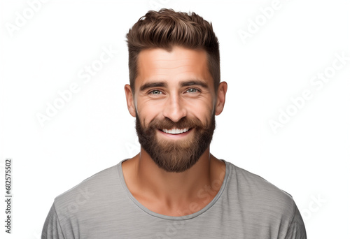 a closeup photo portrait of a handsome man smiling with clean teeth. used for a dental ad. guy with fresh stylish hair and beard with strong jawline. isolated on white background.