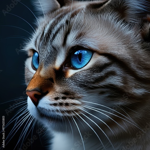 A closeup photograph of a cat's face,highly detailed fur texture,striking blue eyes with depth and dimension,realistic cat portrait,vibrant colors,dramatic lighting and contrast,moody and atmospheric
