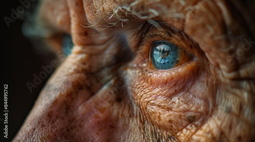 A close-up photograph showcasing the detailed, wrinkled skin and striking blue eye of an elderly person, capturing the depth of emotion and life experience