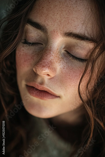 A close-up portrait image focuses on the facial features of a young woman, Her skin appears smooth and natural,visible freckles. The lighting and angle emphasize the natural beauty of her skin