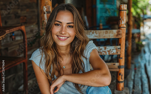A closeup portrait of a Beautiful smiling woman in Los Angeles with a shapely body. She is sitting on a nice lazy boy chair looking away from the camera with her hands very visible and lively. She is