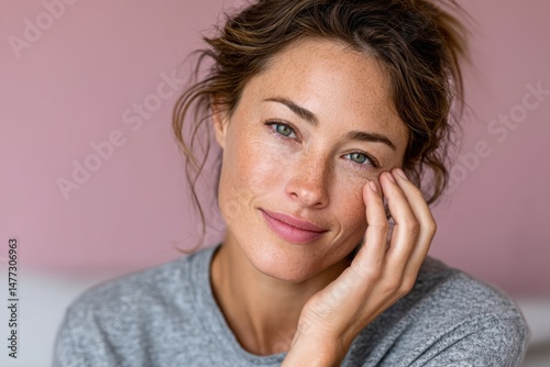 A close-up portrait of a beautiful woman gently smiling, showcasing her natural glow, freckles, and relaxed aura against a soft pink background enhancing her beauty.
