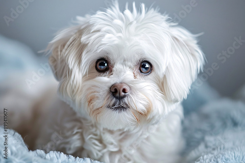 A close-up portrait of a cute and fluffy white dog looking at the camera, perfect for pet-related content and advertising.