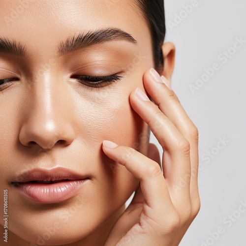 closeup, glowing, skin, latina, model, touching, face, soft, bright, lighting, skincare, aesthetic, premium, radiant, beauty, woman, hispanic, gentle, caress, aglow, cheek, portrait, extreme, macro, detailed, texture, depth, field, sharp, illuminated, vibrant, airy, negative, space, trendy, stock, photo, professional, studio, light, balanced, exposure, cultural, ethnic, feminine, elegant, natural, fresh