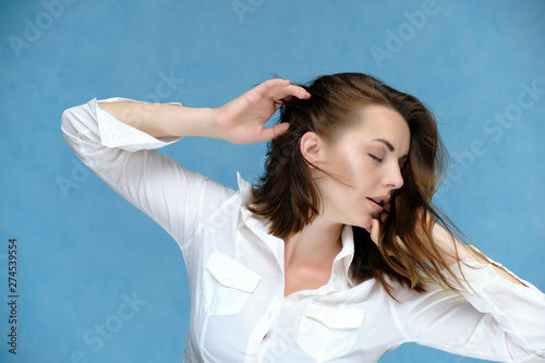 A close-up portrait of a pretty girl, a brunette woman, 30 years old, against a blue background in a white shirt with dark hair and excellent skin. She shows emotions, smiles, wonders.
