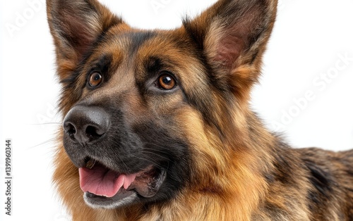 A close-up portrait of a proud German Shepherd dog, pure white background