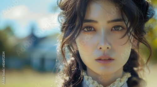 A close-up portrait of a woman with intricate braided hair and vintage clothing, set against a blurred outdoor background on a sunny day