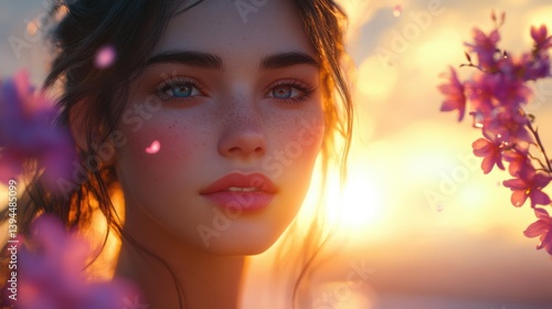 beauty, portrait, woman, flower, sunset, grace, warmth, serene, calmness, moment, dreamy, aesthetic, harmony, feminine, vision, high-coloured, inspiration, youth, peaceful, stunning, glow, soft, photo, emotion, romantic, joy, eye, elegance, expression, delicate, charme, allure, captivating, freckle, blossom, love, scenic, light, art, creative, detail, colours, pink, nature, background, closeup