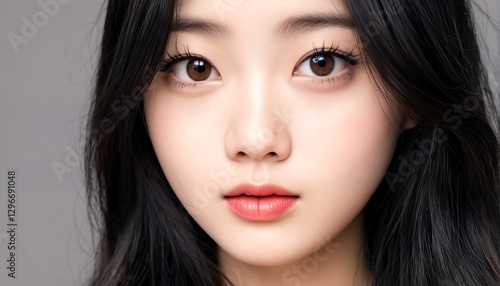 A close-up portrait of an Asian woman with long black hair and brown eyes.