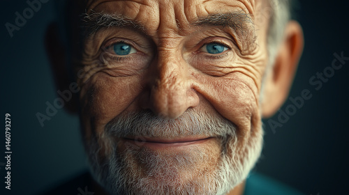 portrait, closeup, grey hair, beard, blue eye, smile, wrinkle, face, head, human, person, caucasian, old, older, aged, mature, wise, experienced, thoughtful, gentle, kind, friendly, positive, calm, indoor, isolated, dark background, neutral, natural light, facial features, detail, skin, texture, character, ageing, age, senior, elderly, male, eye, wrinkled, 1