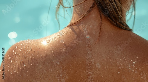 water droplets, shoulder, back, woman, closeup, sensual, refreshing, hydratation, swimming pool, blue water, summer, relaxation, spa, skincare, glistening, drop, fresh, vacation, beauty, luxurious, clean, body, wellness, dermatology, water, cool, detail, macro