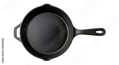 A close-up shot of a black cast iron skillet, ready for cooking. The skillet has a handle and is set against a clean backdrop
