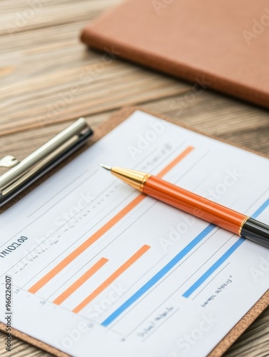 A close-up shot of a clipboard with a business plan, a pen, and a graph. The pen is resting on the graph, suggesting a readiness to analyze and strategize. The graph symbolizes progress, growth, and f