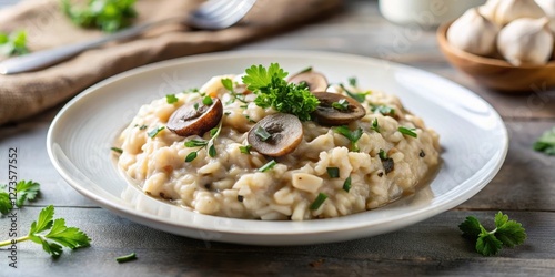 A close-up shot of a creamy mushroom risotto garnished with a sprinkle of black pepper and a few strands of fresh parsley, resting on a clean white plate , dinnerware, food styling